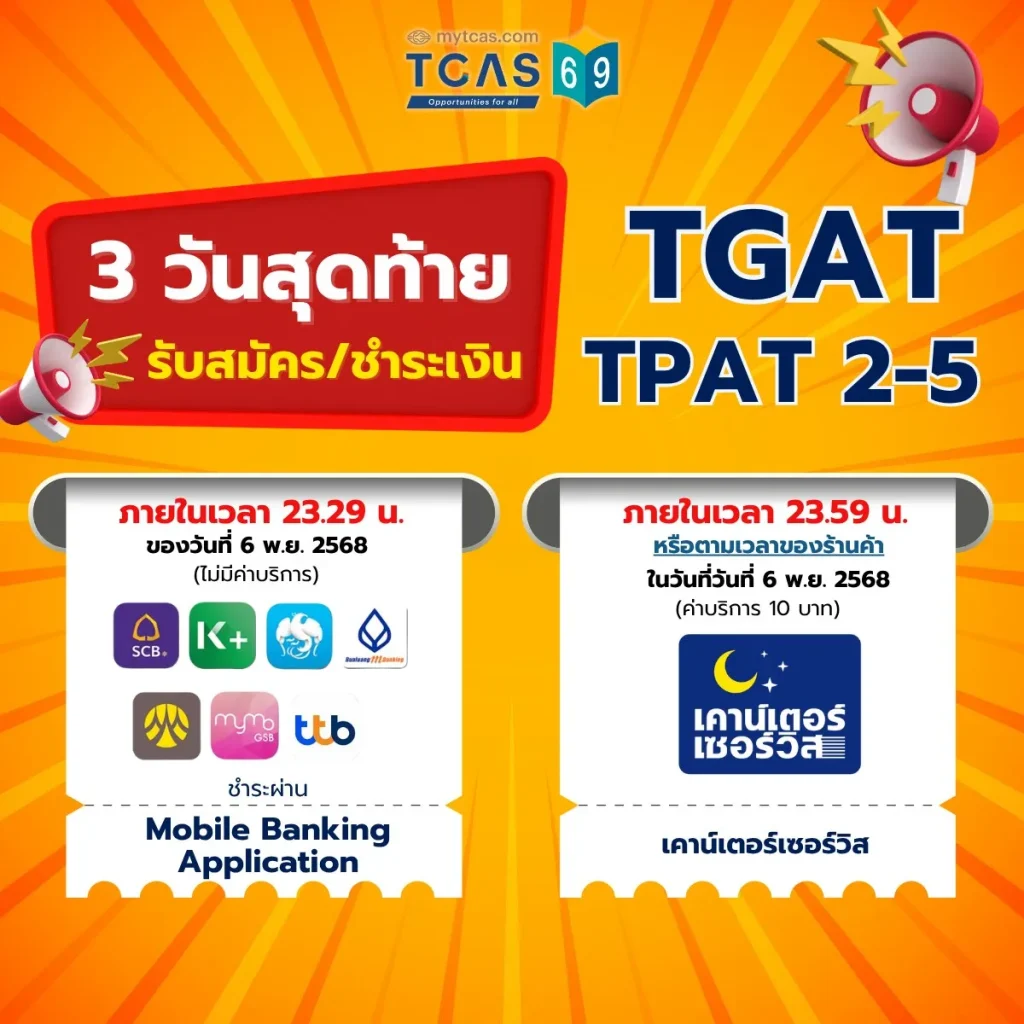 น้องๆ #Dek69 เช็กด่วน! เหลือเวลาอีกแค่ 2 วัน สุดท้ายเท่านั้น! สำหรับการสมัครและชำระเงินค่าสอบ TGAT/TPAT 2-5 ![]()